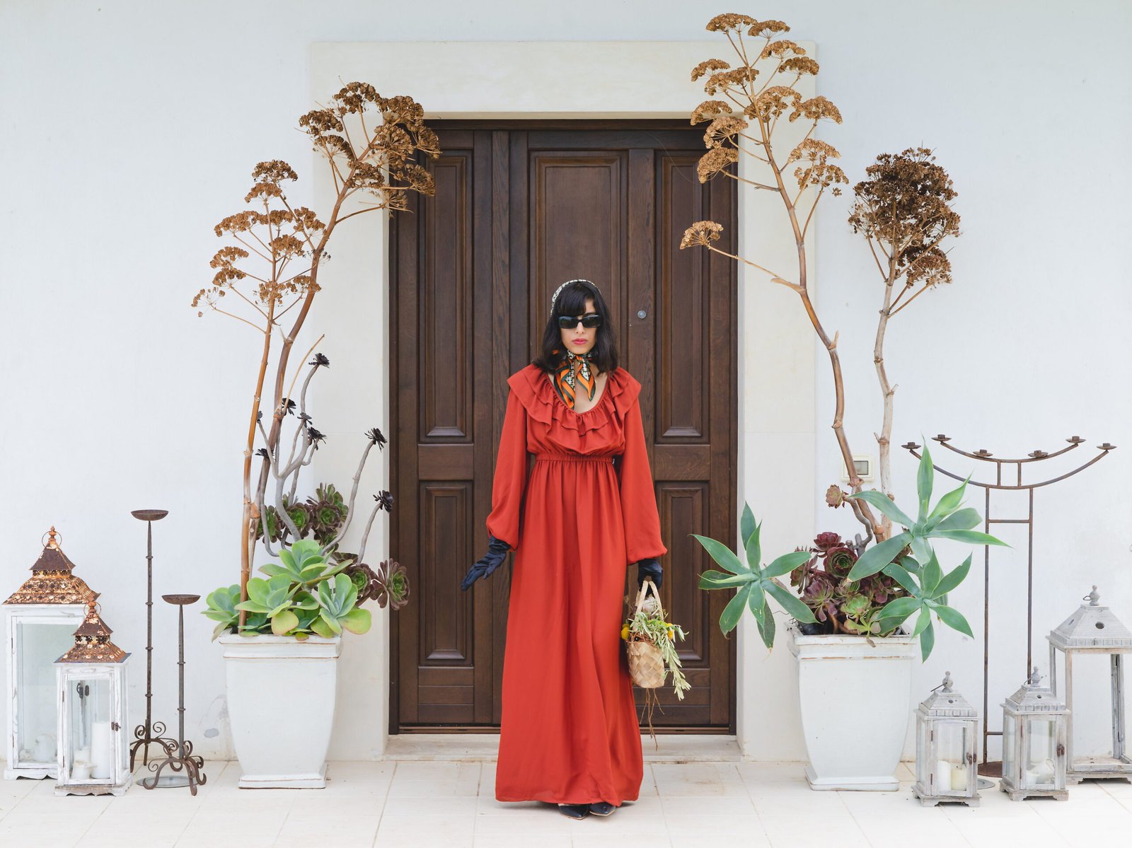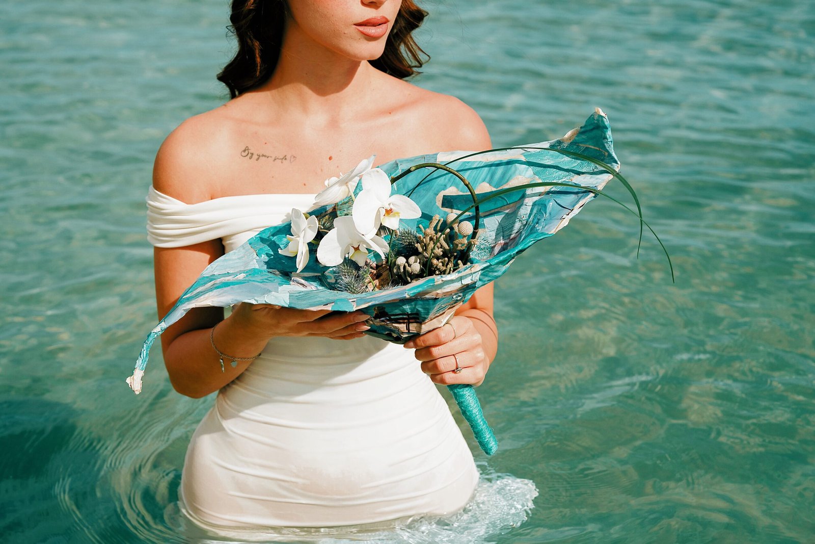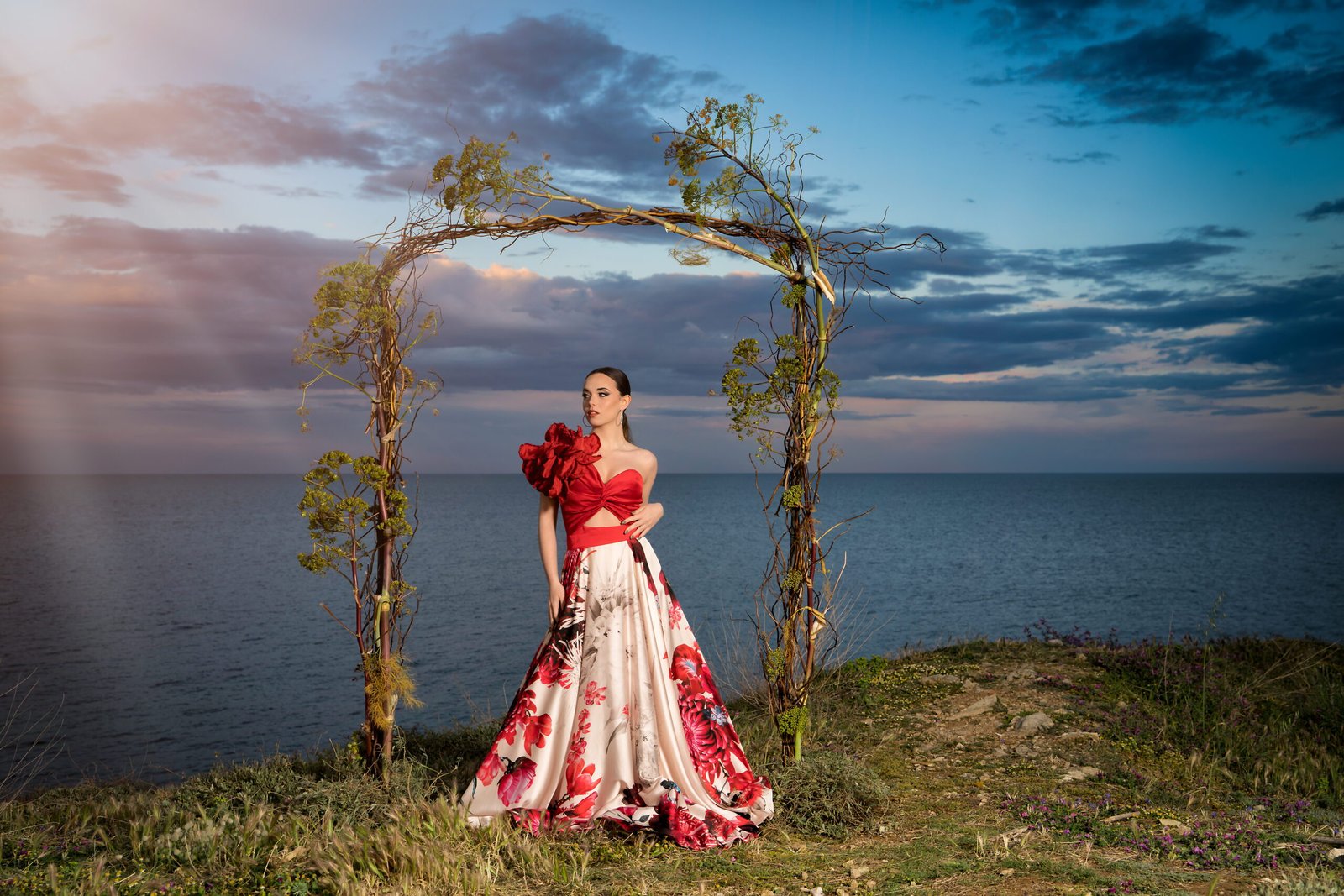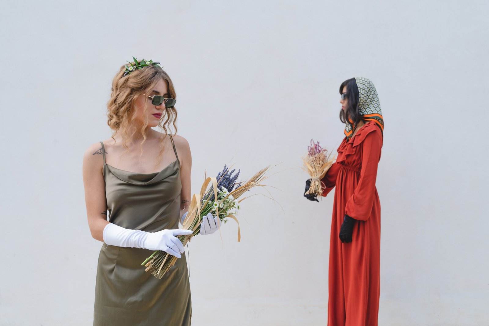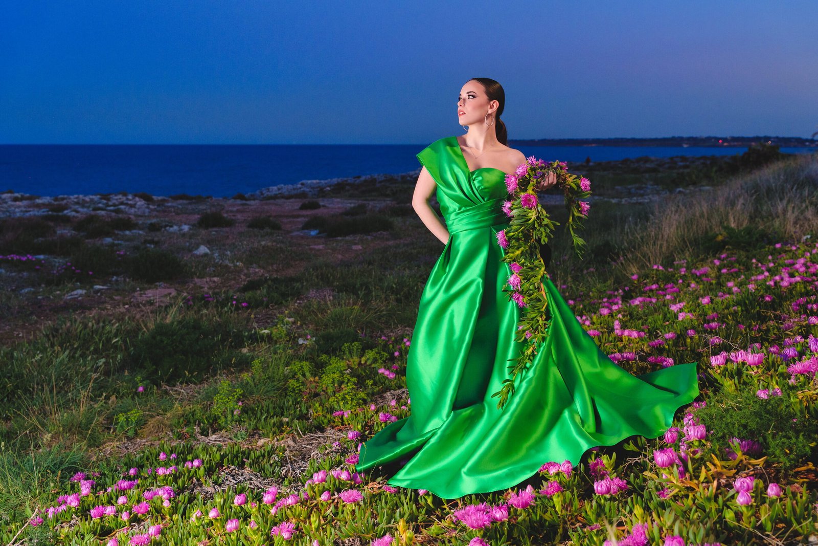 Flowers gathered from the surrounding landscape echo the tones of the dress, dissolving the boundary between couture and environment.